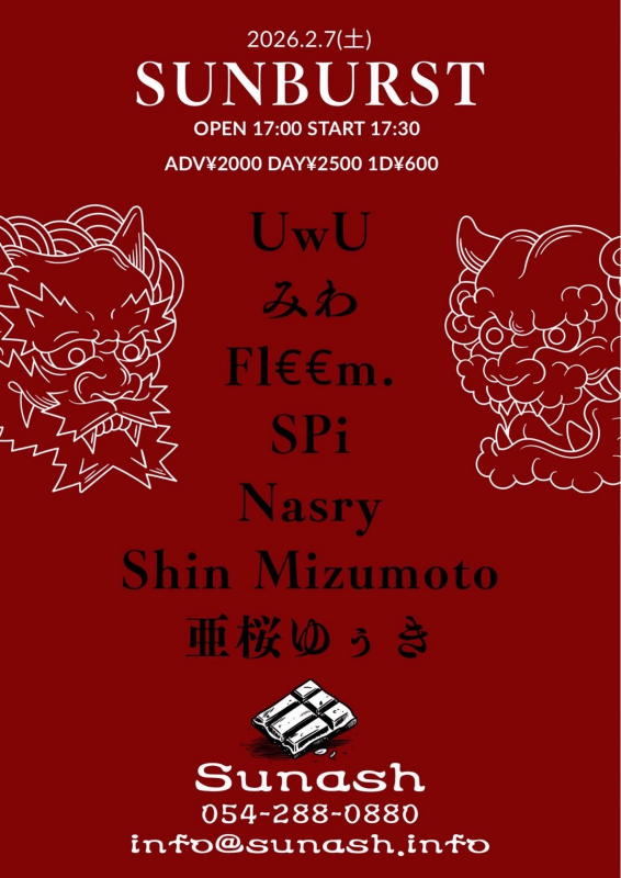 2/7 SAT Sunash presents 【SUN BURST】 OPEN 17:00/START 17:30 ADV 2,000/DAY 2,500 |