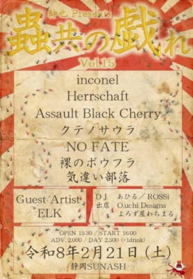 -act- 気違い部落 inconel Herrschaft Assault Black Cherry NO FATE 裸のボウフラ クテノサウラ -guest Artist- ELK -DJ- あひる ROSSi -出店- O.uchi Designs よろず屋わちまる。 |