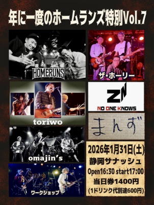 1/31 SAT 【年に一度のホームランズ特別 vol.7】 OPEN 16:30/START 17:00 ADV 1,400/DAY |
