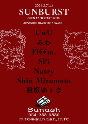2/7 SAT Sunash presents 【SUN BURST】 OPEN 17:00/START 17:30 ADV 2,000/DAY 2,500 |